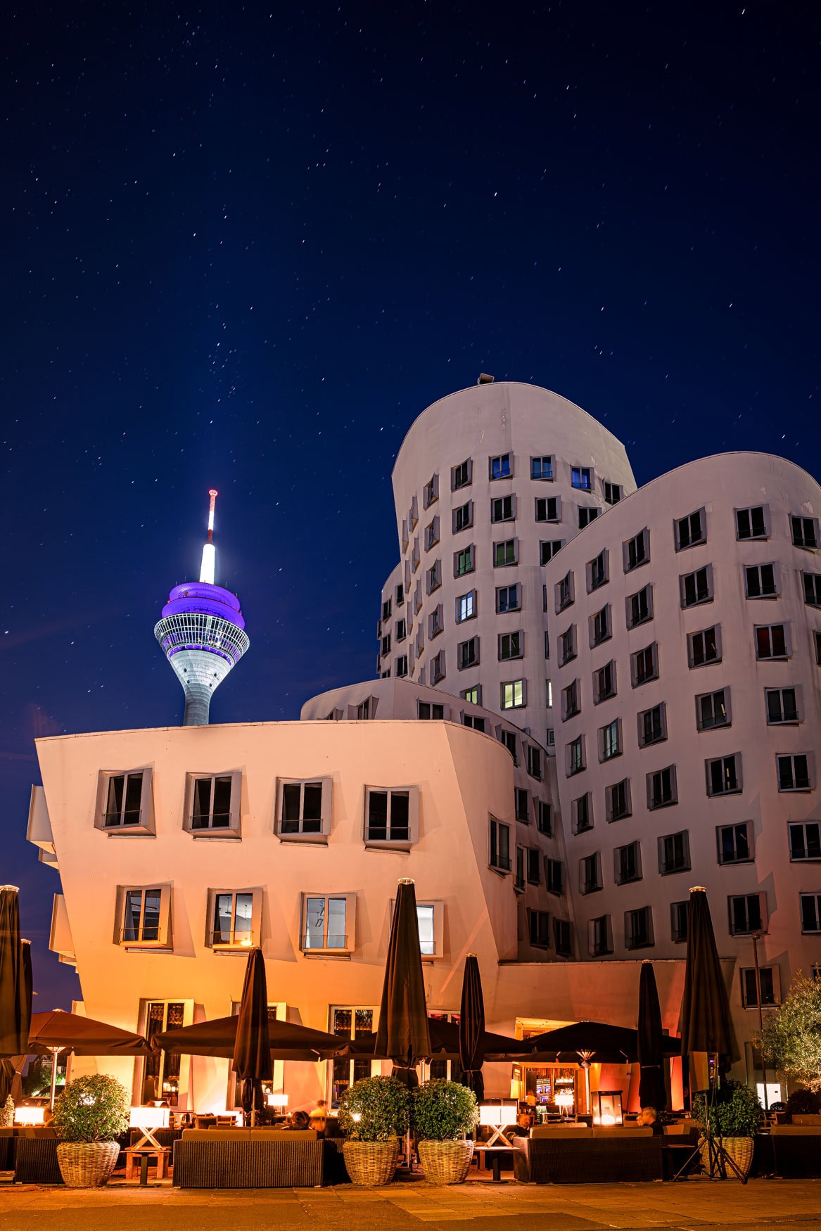 Hier wird gebauter Raum zur Bühne für das Licht: Der Düsseldorfer Rheinturm und die ikonischen Gehry-Bauten unter einem sternenklaren Himmel – ein leuchtendes Nachtportrait.