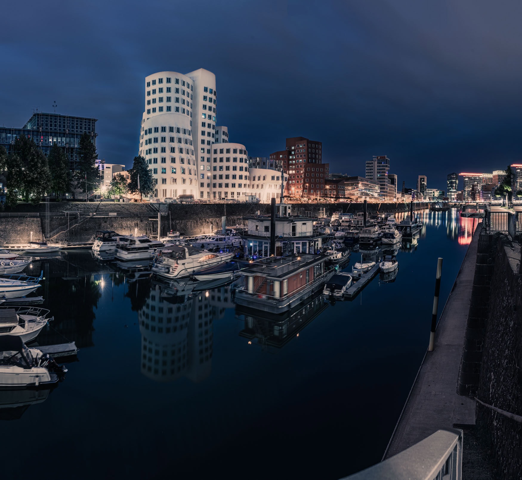 Wenn das Wasser zur Leinwand wird: Die Gehry-Bauten und Boote im Düsseldorfer Medienhafen wirken wie eingefroren im Licht der Nacht – urban, elegant, zeitlos.