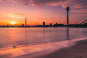 Zarter Dunst über dem Rhein, weiche Wasserstruktur durch Langzeitbelichtung und ein Himmel in Pastelltönen: Der Morgen öffnet die Silhouette von Rheinturm und Brücken im warmen Licht. Feinkörniger Sand im Vordergrund, ruhige Fließbewegung, klare Linien – ein stiller Moment zwischen Stadt und Natur.