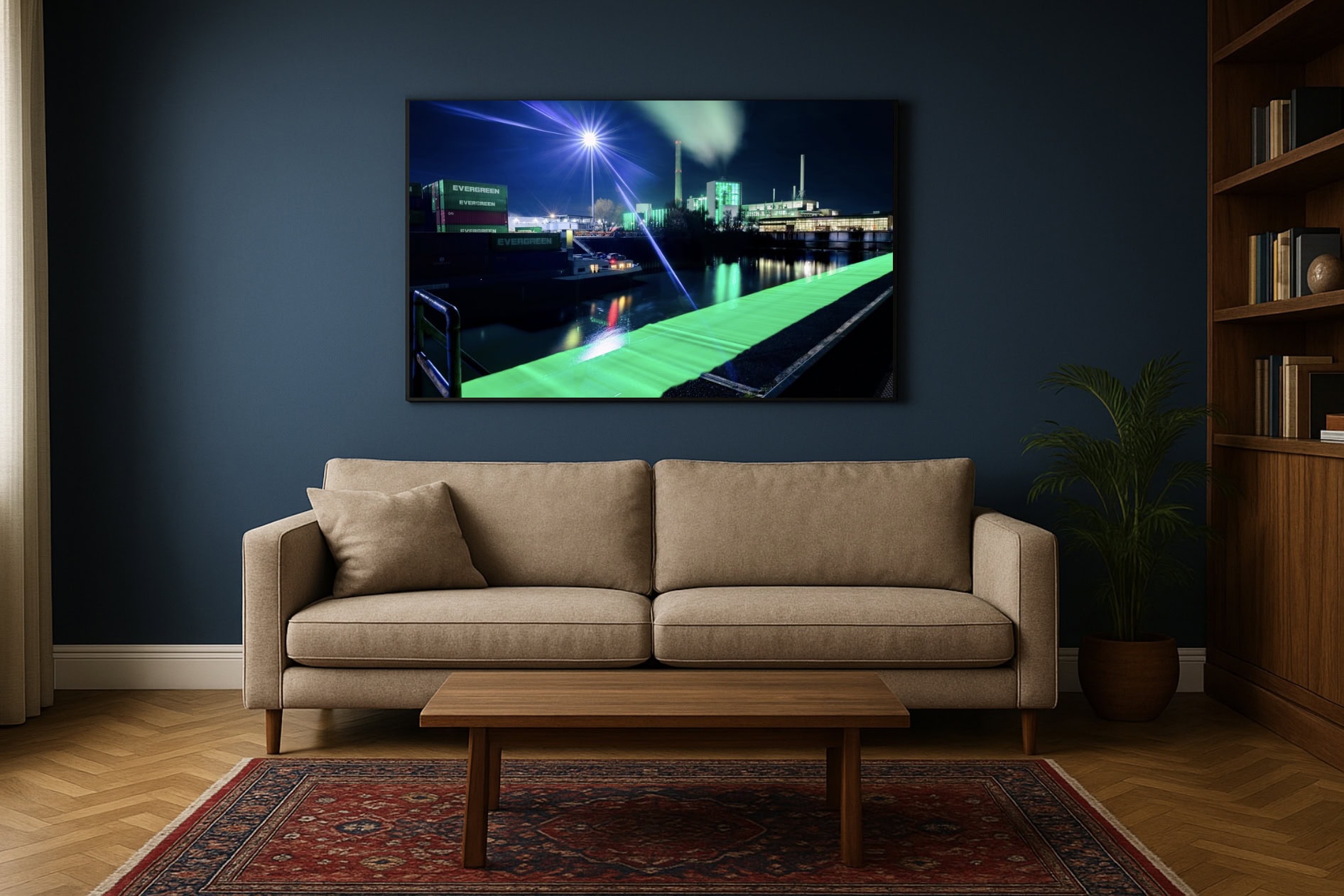 Die Szene selbst ist reduziert: links Container, rechts die Architektur des Gaskraftwerks, darüber Dampf und eine sternförmige Leuchte. Das Grün der Lausward war das Leitmotiv; die Spur im Vordergrund greift es auf und führt diagonal in die Tiefe. Mehrere Testaufnahmen halfen, Symmetrie, Dichte und Belichtungszeit auszutarieren, bis Ruhe und Spannung zugleich entstanden. Die Leuchte habe ich bewusst weich auslaufen lassen – als Gegenpol zur präzisen Kante der Lichtbahn.