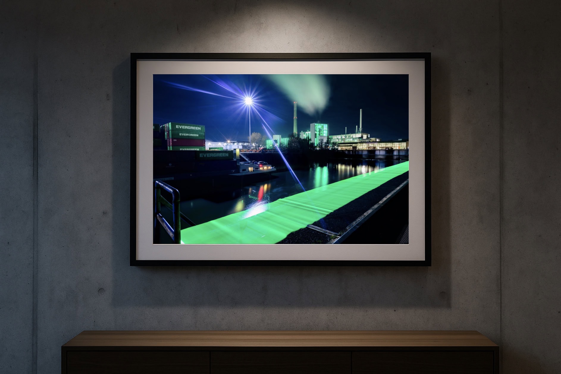 Kunstfotografie aus Düsseldorfs Industriehafen: Das Gaskraftwerk Lausward glüht in Smaragd, davor zieht eine bewusst geformte Lichtspur über Wasser und Kaimauer. Präzise Langzeitbelichtung, kontrollierte Farbe und klare Linien verdichten sich zu einer ruhigen, futuristischen Nachtkomposition.