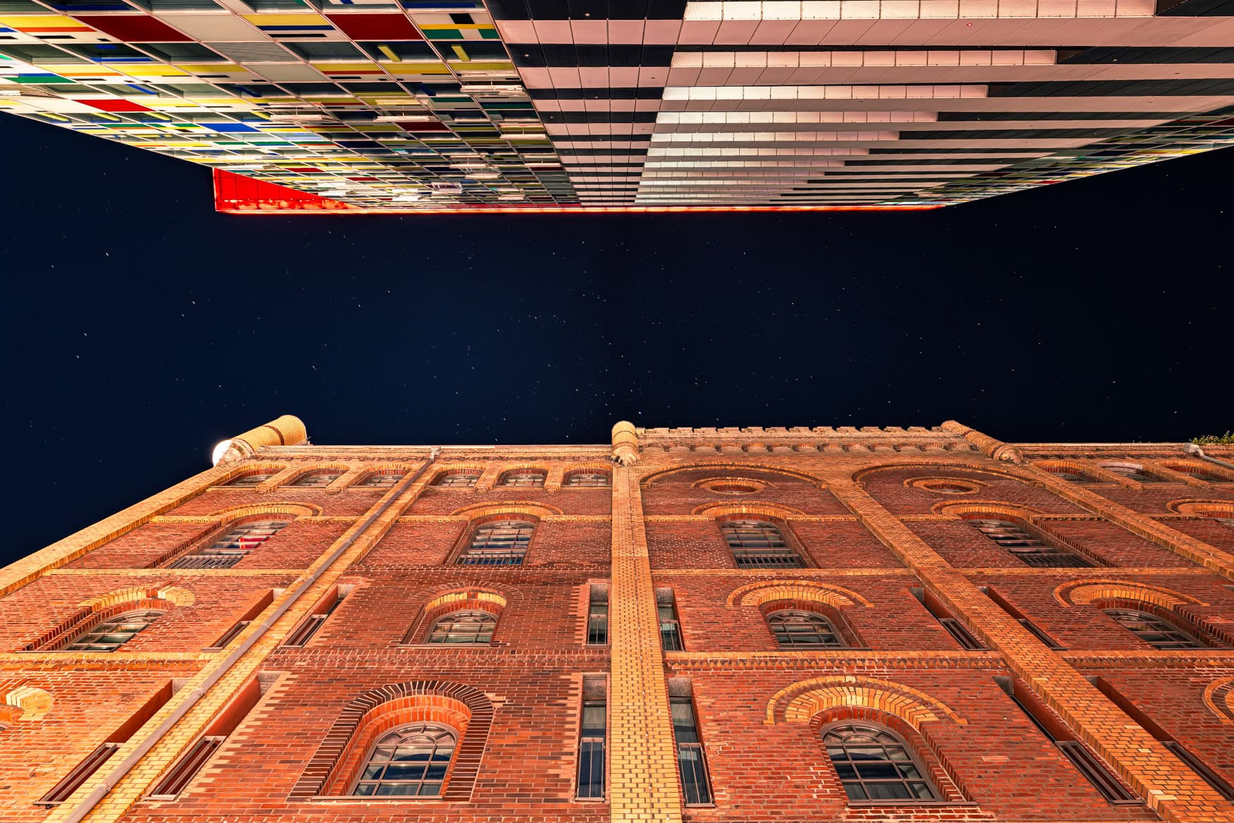 Der Medienhafen zeigt sich aus der Froschperspektive – futuristische Linien, kaltes Licht und ein Himmel voller Sterne.