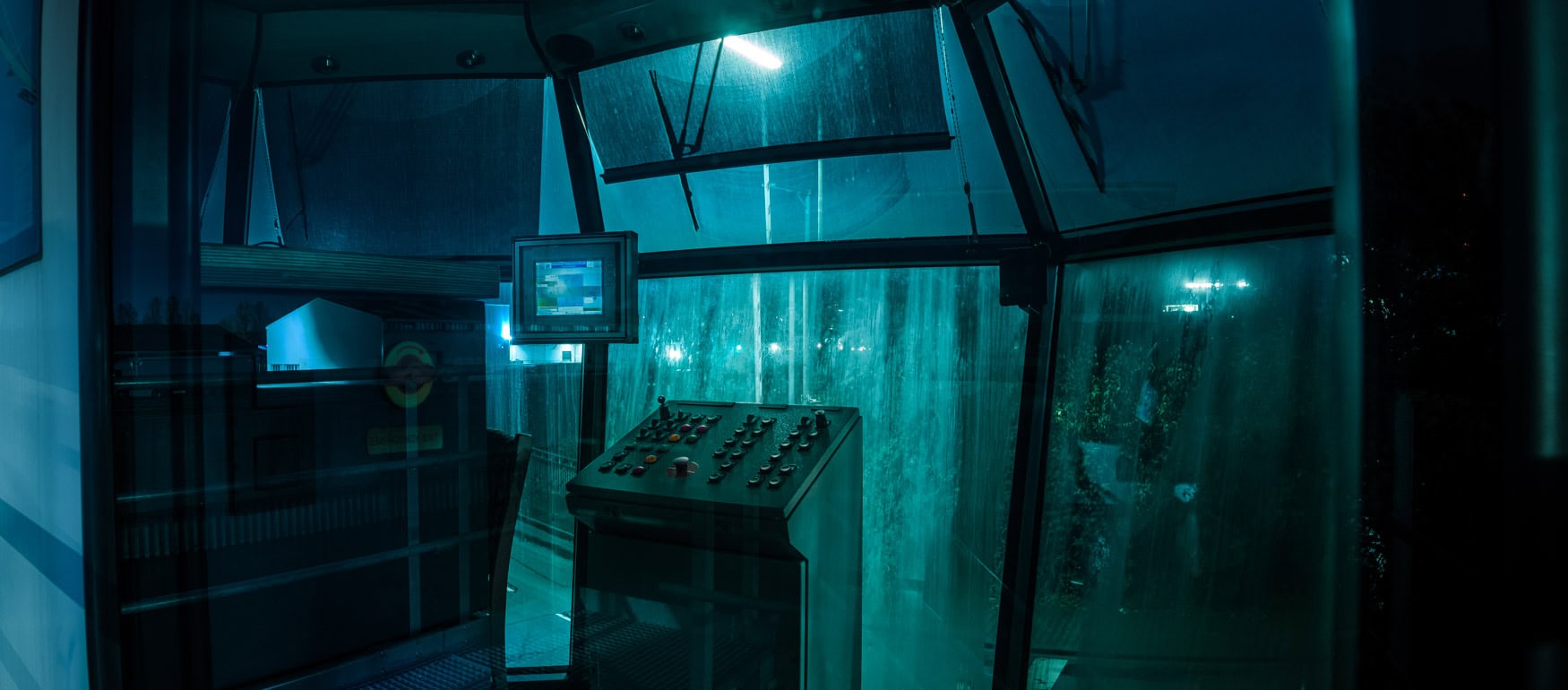 Verlassen und rau wacht das Steuerhaus im Düsseldorfer Hafen – gezeichnet von Regen, Dunst und der Dunkelheit der Nacht.