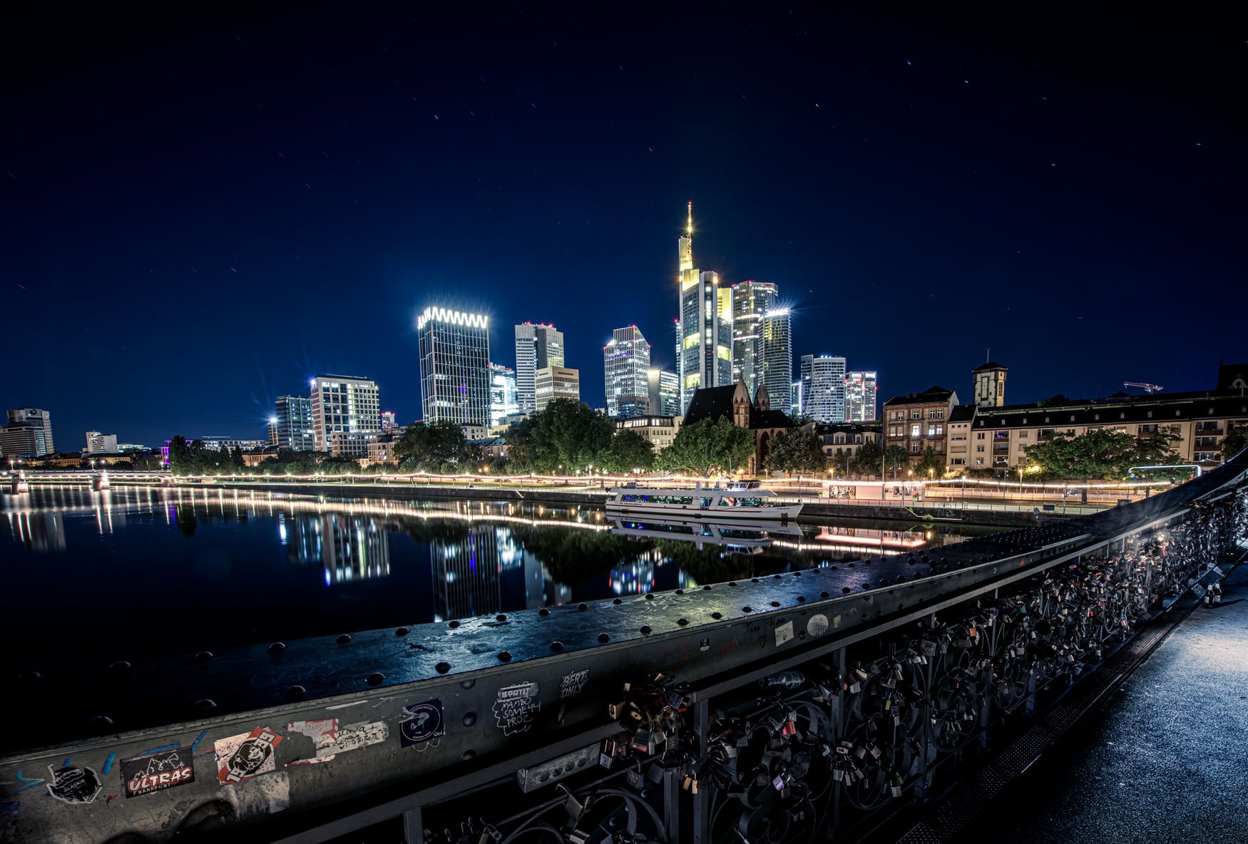 Im Zentrum der Fine-Art-Fotografie stehen moderne Hochhäuser mit leuchtenden Fassaden und klaren Konturen, eingerahmt von niedrigeren Gebäuden entlang des Mainufers. Eine helle Lichterkette folgt der Uferpromenade und zeichnet eine weiche Linie durch die urbane Landschaft. Im Vordergrund verläuft ein Brückengeländer mit zahlreichen Liebesschlössern und Aufklebern, das diagonal in das Bild führt und Tiefe schafft. Das Wasser wirkt dunkel und glatt, die Spiegelungen der Architektur setzen helle Akzente. Der wolkenlose Nachthimmel mit feinen Sternspuren verstärkt die ruhige, zugleich energiegeladene Atmosphäre dieser Stadtlandschaft.