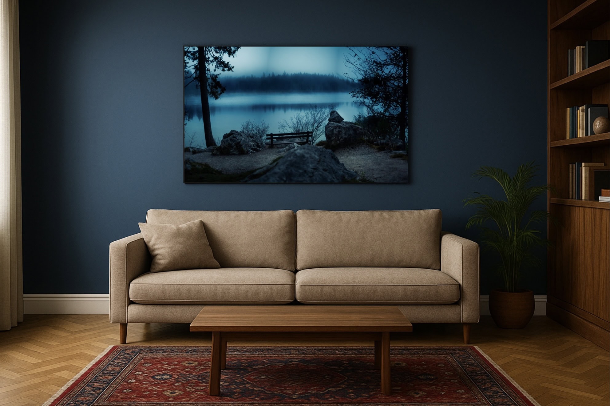 Gedruckt auf hochwertigem Canvas und auf einen stabilen Holzrahmen gespannt, entsteht ein fertiges Wandbild mit natürlicher Tiefe und ruhiger Präsenz – ganz ohne zusätzliche Rahmung.