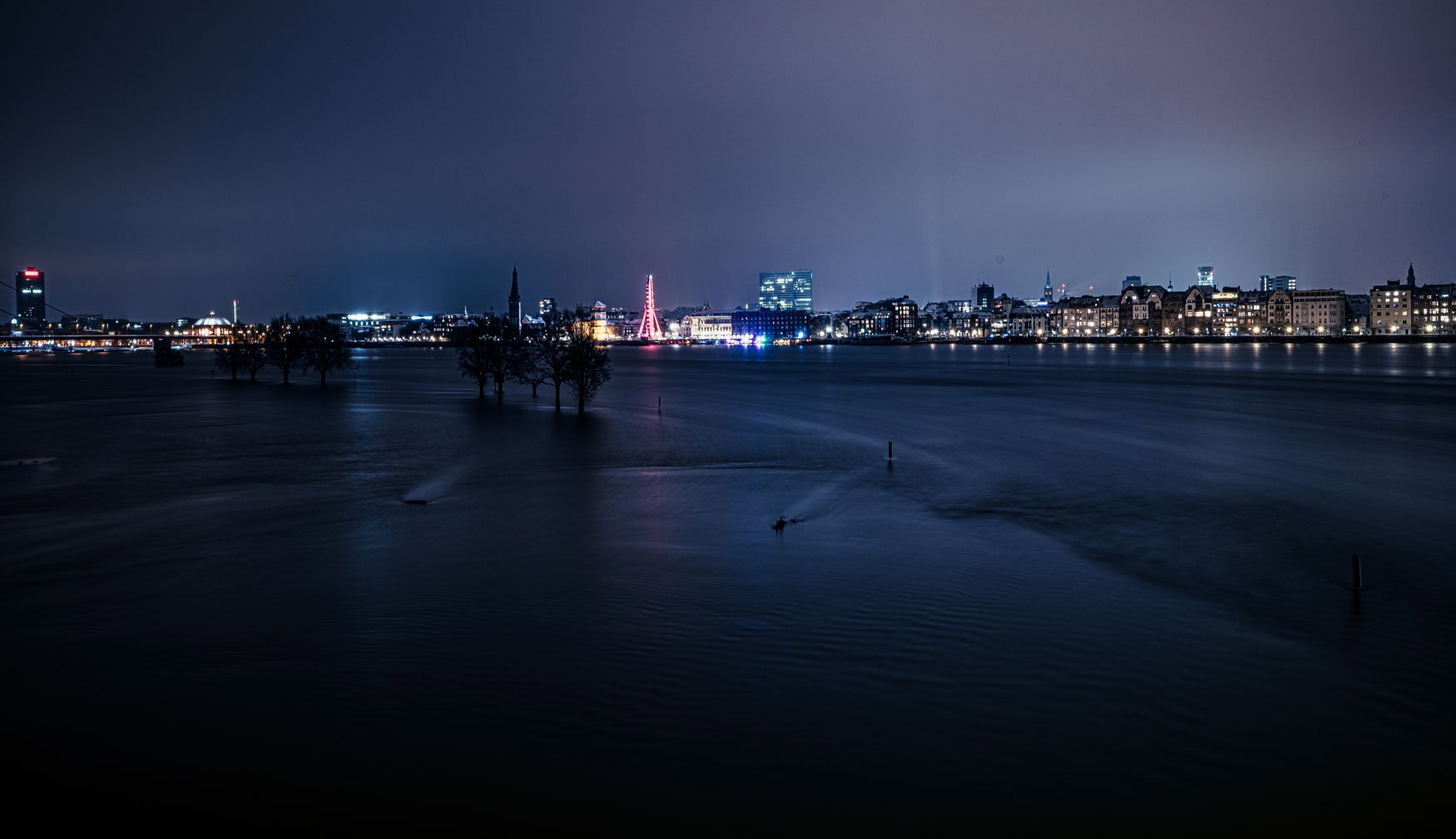 Während der Winterflut steigt der Rhein bis an die Baumkronen. Diese nächtliche Langzeitbelichtung zeigt Düsseldorfs Altstadt im Licht der Wassergewalten.