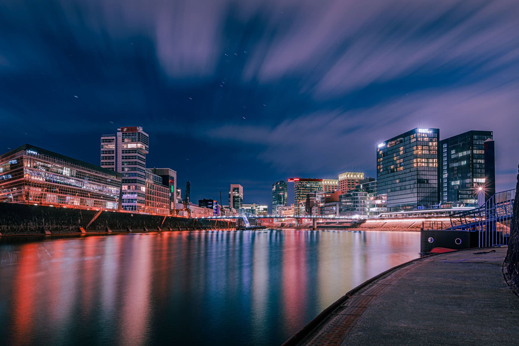Die Lichter der Stadt tanzen auf dem Rhein, während die Wolken über dem Medienhafen wie gemalt vorbeiziehen – eine Szene wie aus einem Traum.