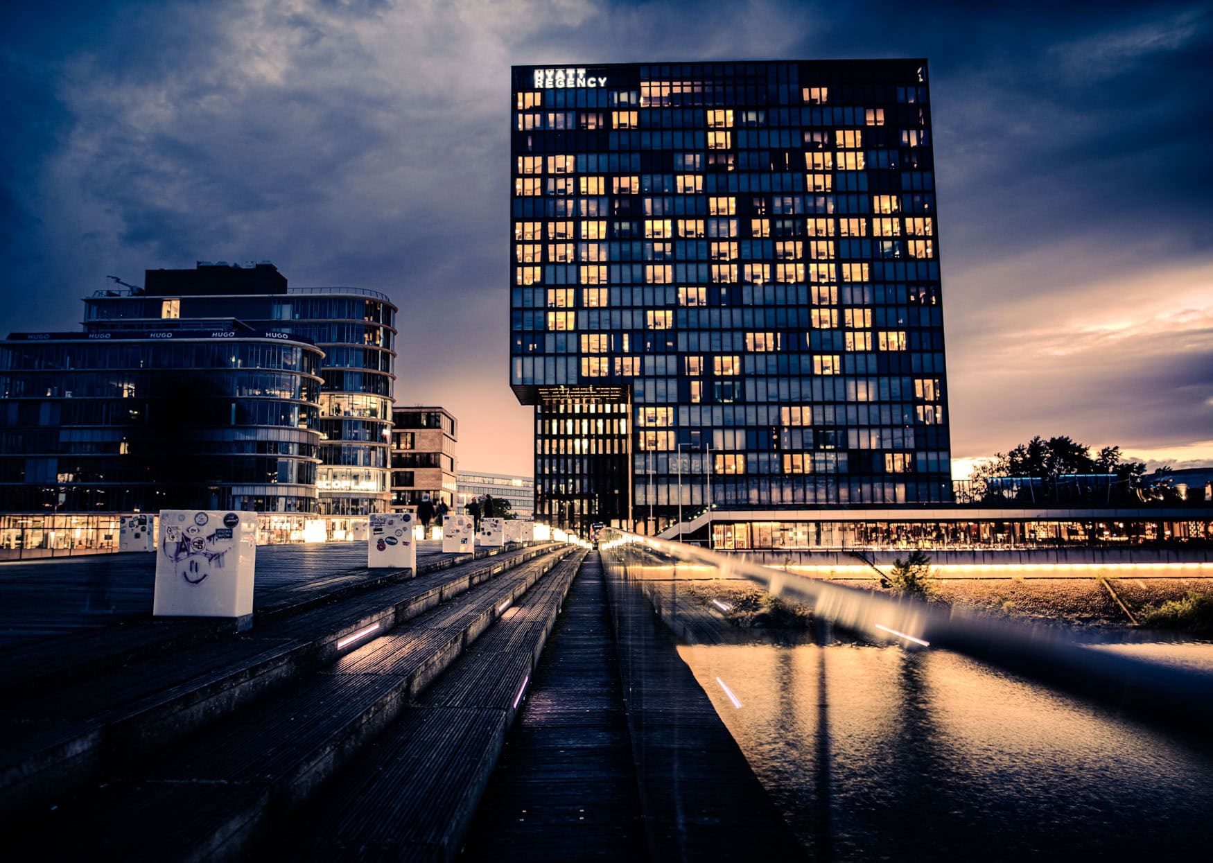 Leuchtende Fenster, dramatischer Himmel und perfekte Linienführung – dieses Bild des Hyatt Regency bringt den urbanen Zauber Düsseldorfs auf den Punkt.