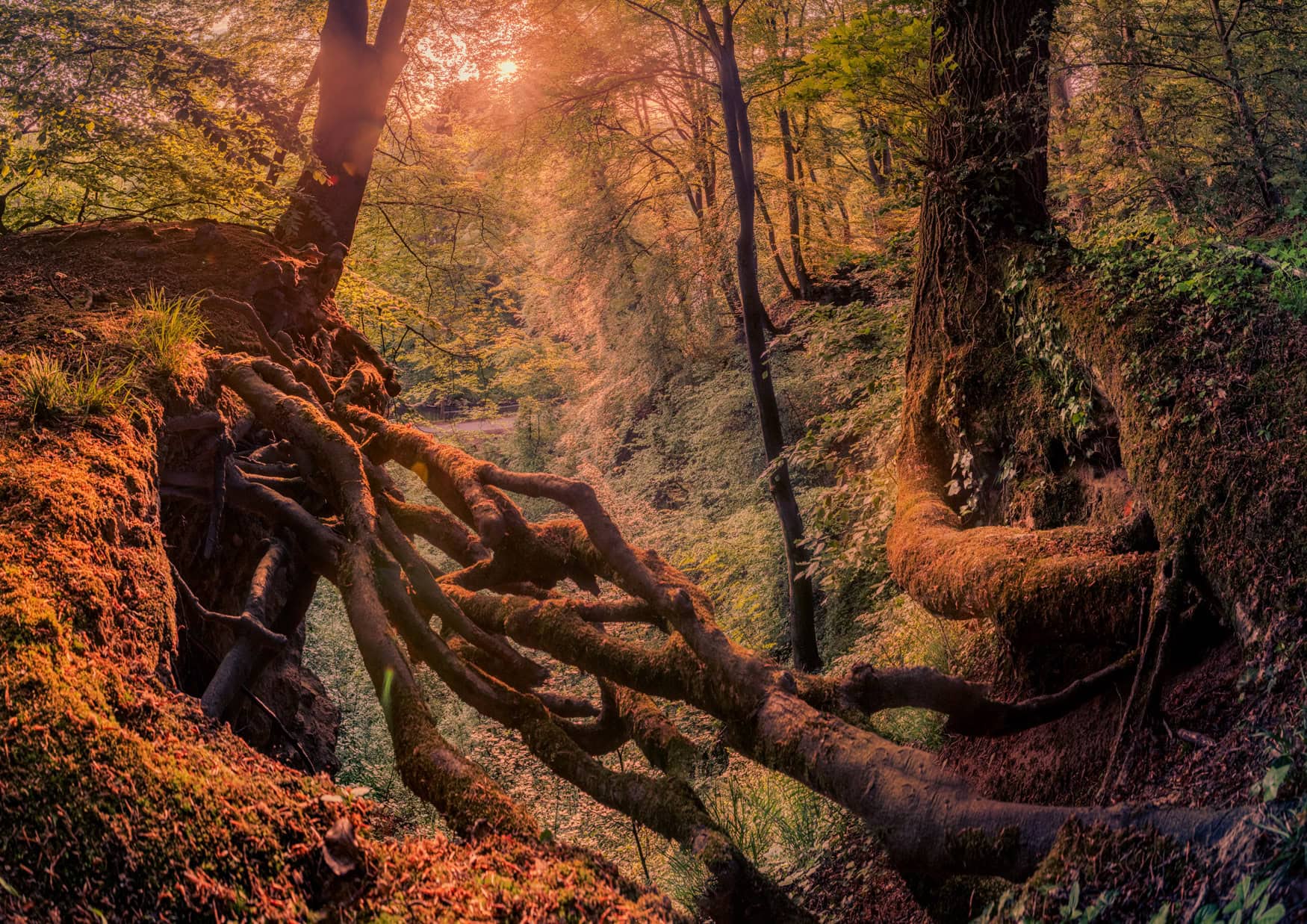 Verzauberte Wurzeln und moosbedeckte Wege im Neandertal – wo Sonnenstrahlen die Magie des Waldes wecken.