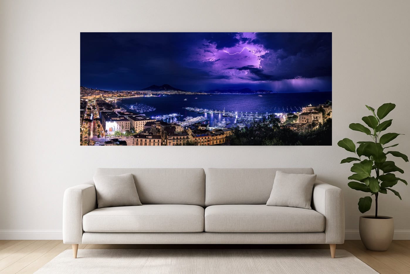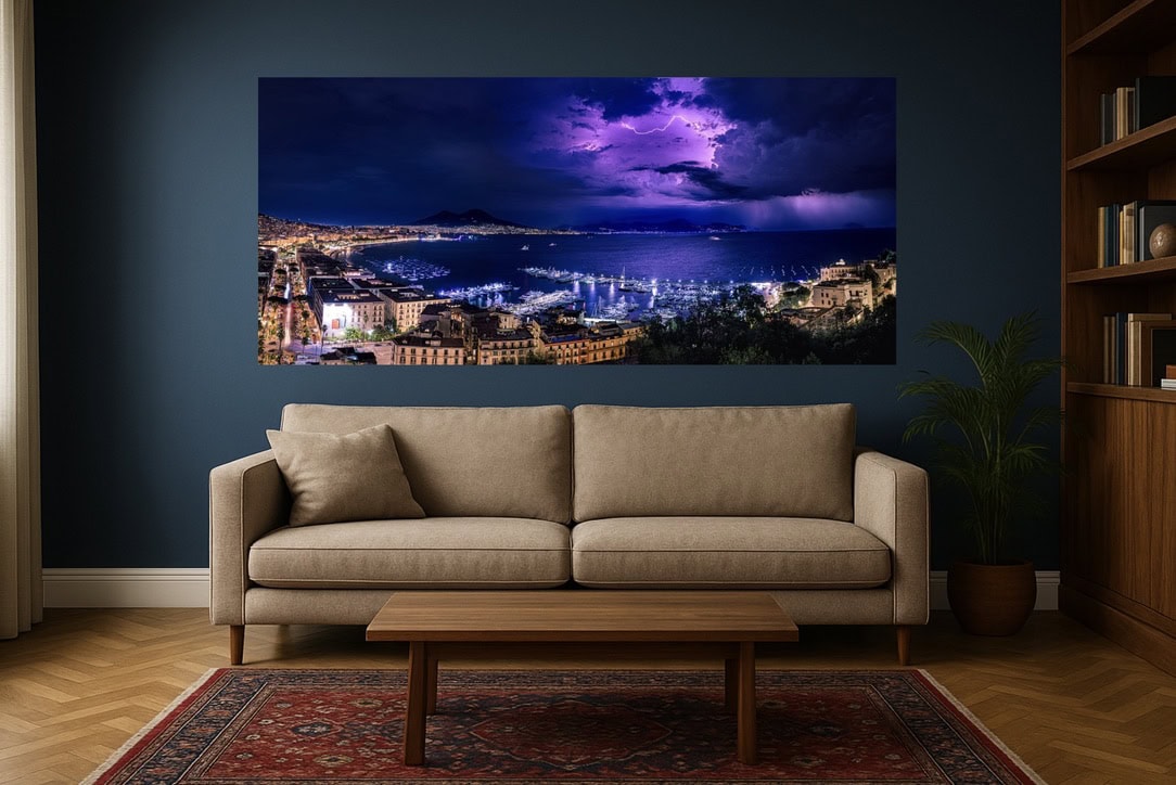 Ein epischer Blick über den Golf von Neapel – ein tobendes Gewitter mit Blitzen über dem Vesuv, eingefangen in dramatischer Nachtstimmung.