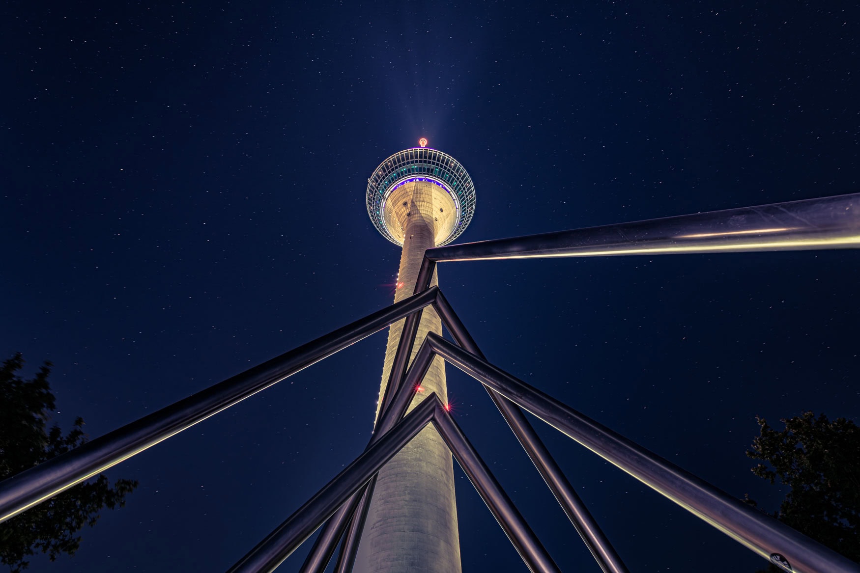 Rheinturm Düsseldorf bei Nacht mit Sternenhimmel