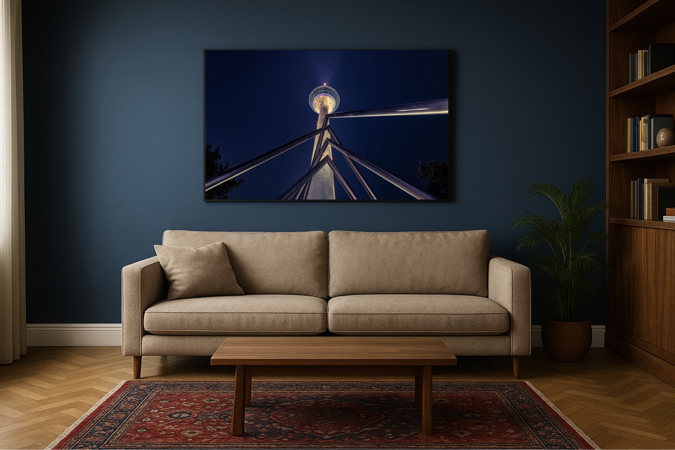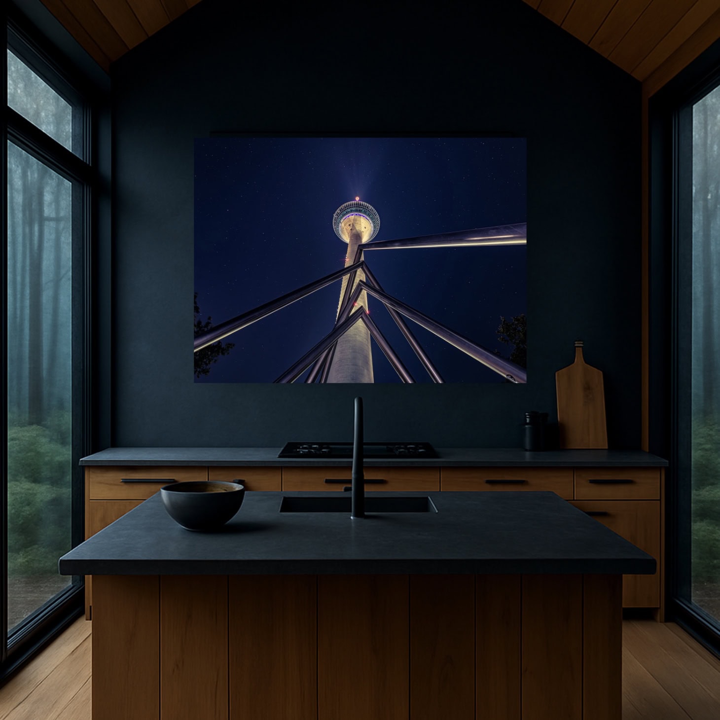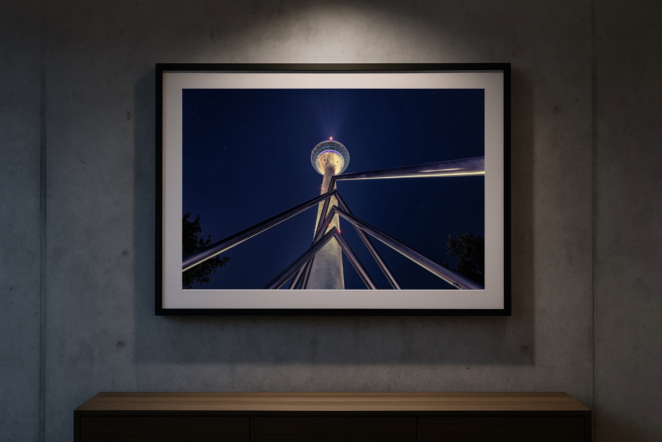 Ein Sternenkompass über dem Rhein: Der Rheinturm steigt durch die klare Geometrie der Skulptur in den Nachthimmel. Ruhig, präzise, architektonisch – ein Statement für Liebhaber moderner Stadtfotografie.