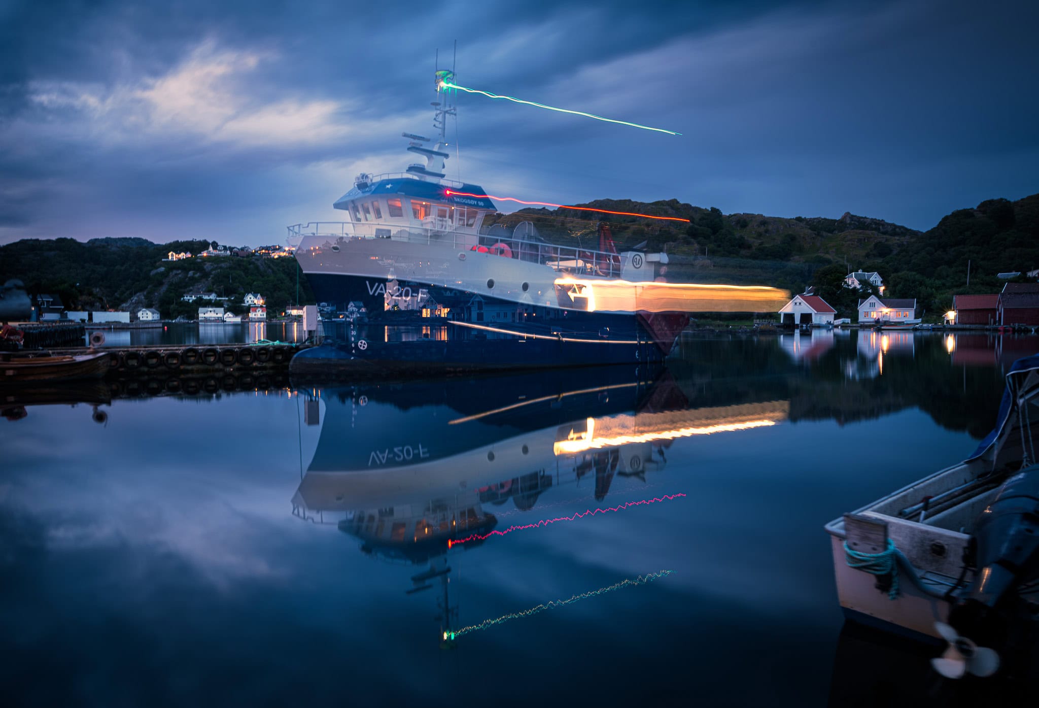 Ein Boot gleitet lautlos durch den spiegelglatten Fjord von Hidra – Lichtspuren erzählen vom Leben auf dem Wasser