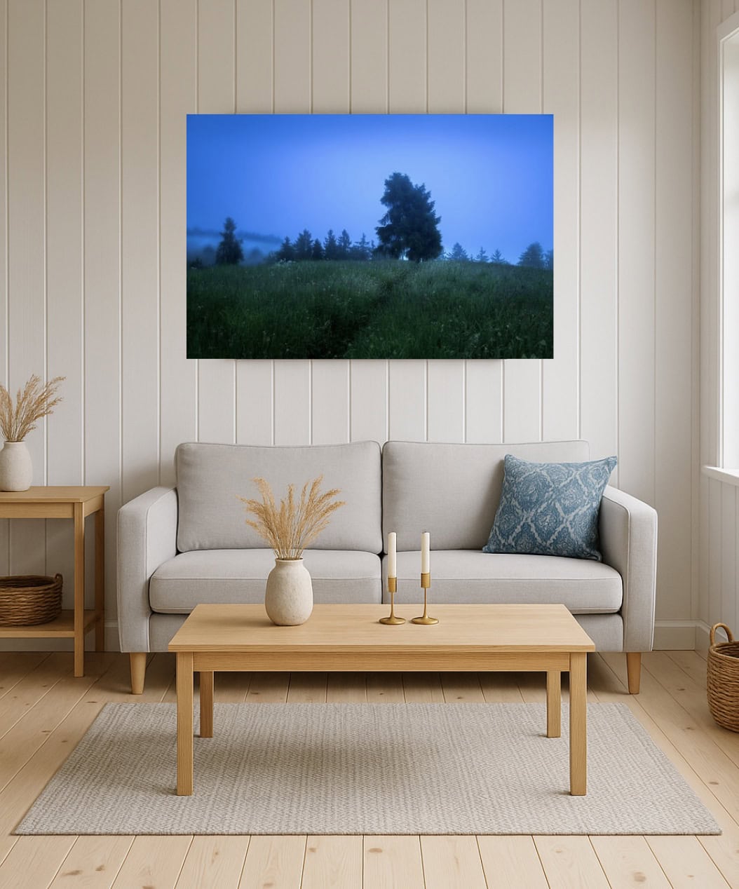 Auf den Wiesen von Oberbozen führt ein schmaler Pfad zu einer alten Fichte. Die Blaue Stunde legt kühles Licht über Gräser und Wildblumen, feine Nebel ziehen am Waldrand vorbei. Ein stilles Bild über Ankommen und Ruhe – aufgenommen in Südtirol.