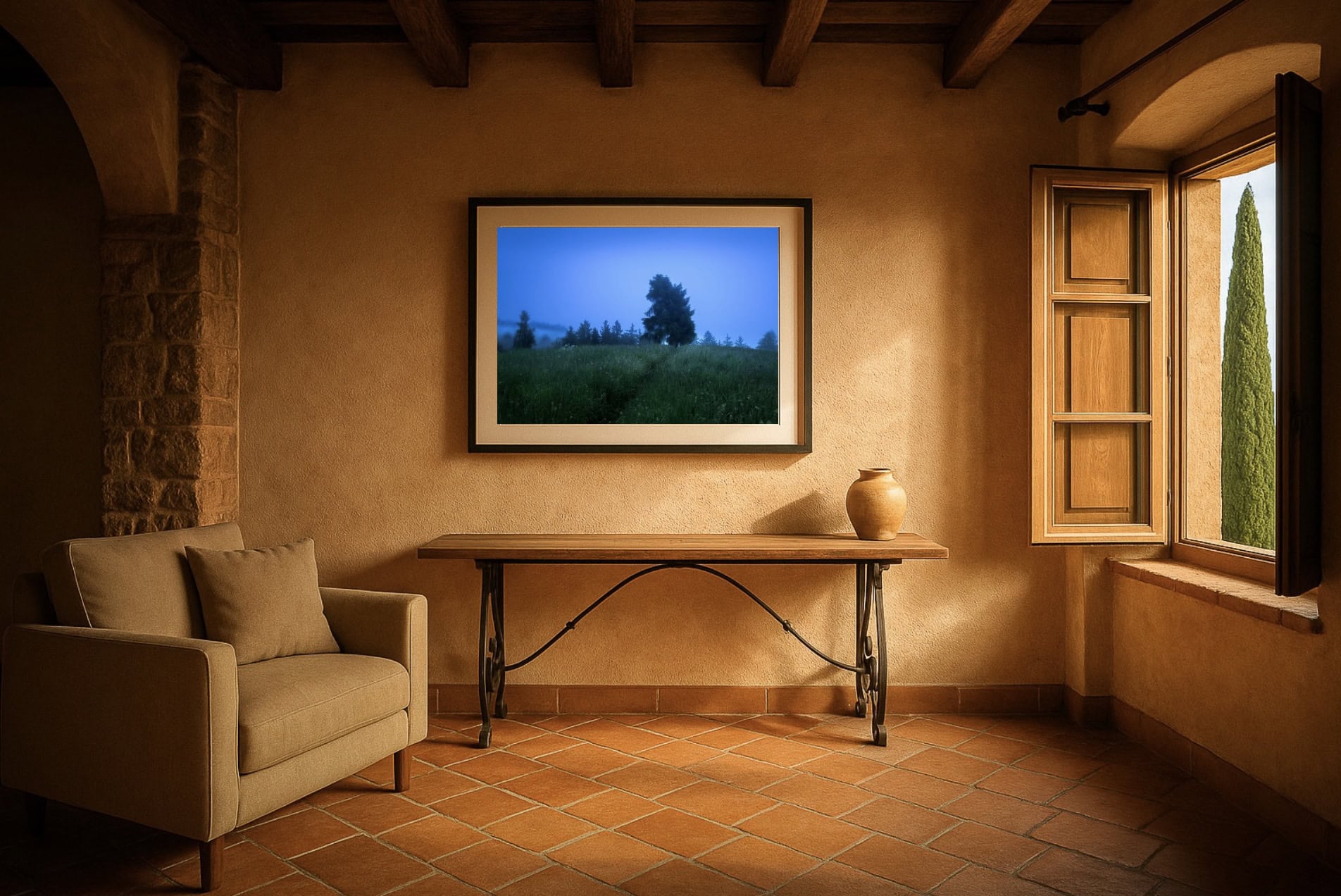 Kurz darauf kamen die Fronten. Dauerregen, nasses Gras, beschlagendes Glas – nur wenige Versuche waren möglich. Zwischen kurzen Pausen holte ich die Kamera hervor, setzte bewusst auf Ruhe, klare Linien und das weiche Blau der Blauen Stunde. Dieses Bild ist eines der letzten des Abends: Wiese, Pfad und Baum greifen wie selbstverständlich ineinander; feine Nebelschichten legen eine stille, poetische Tiefe über die Szene und lassen Südtirols Hügelland fast zeitlos wirken.