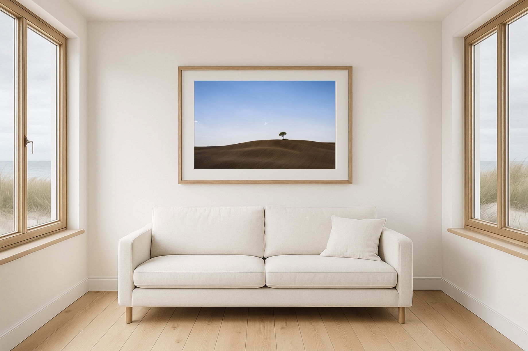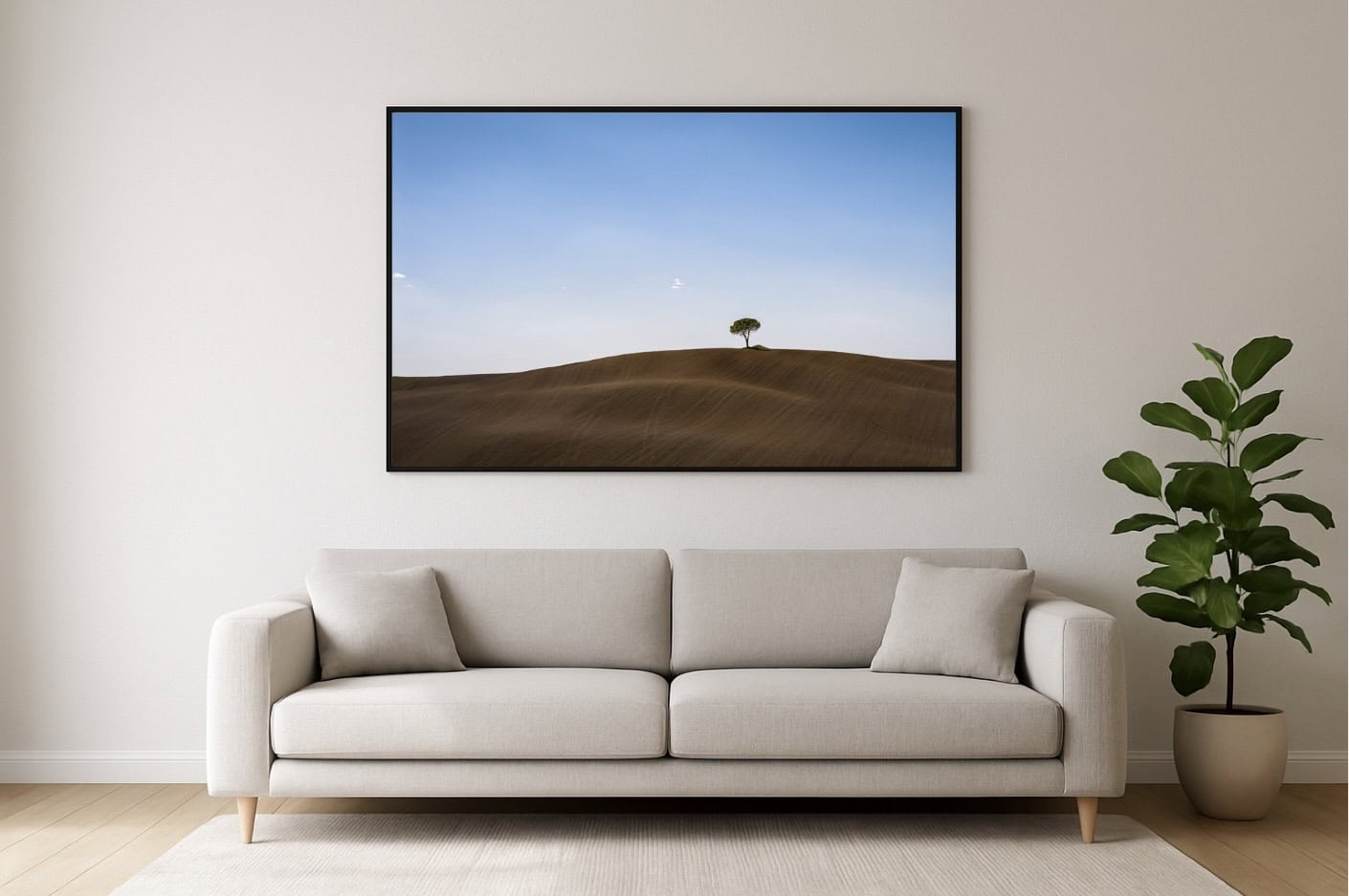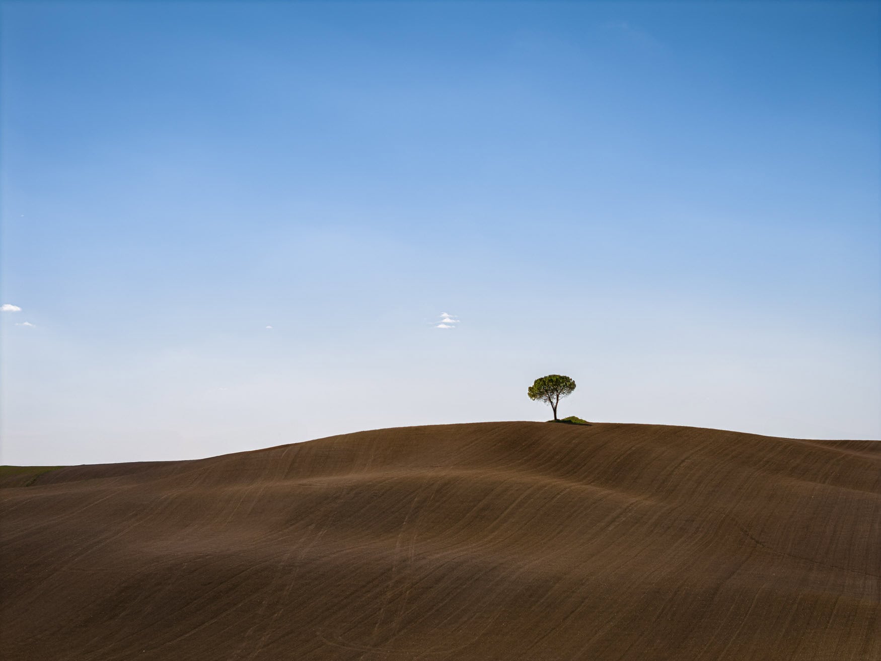 Entscheidend war die radikale Reduktion: drei Bestandteile tragen das Bild – das dunkelbraune, geliniente Erdrelief, die kleine Pinie als ruhiger Fixpunkt und der klare Himmel mit feinem Helligkeitsverlauf. Die Traktorspuren ließ ich bewusst stehen; sie geben Richtung, Maßstab und Tiefe. Gleichzeitig sorgt die weiche Modellierung der Hügel für eine natürliche, fast haptische Ruhe. So bleibt das Motiv trotz Einfachheit reich: Man wandert mit dem Blick über Linien, folgt dem leichten Bogen der Kuppe und ruht am Baum. Gedruckt entfaltet diese Ruhe ihre ganze Wirkung: klare Flächen, viel Atem, zeitlose Präsenz an der Wand.