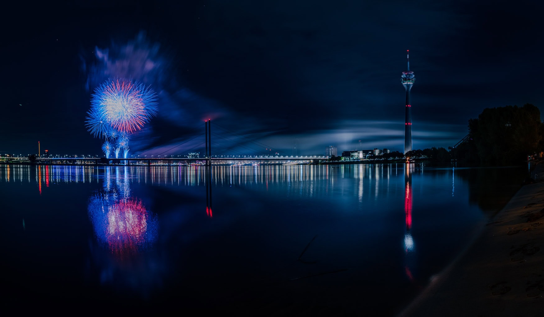 Blaue und rote Lichter explodieren über der Stadt – das Rheinufer wird zur Kulisse eines sommerlichen Nachtspektakels.