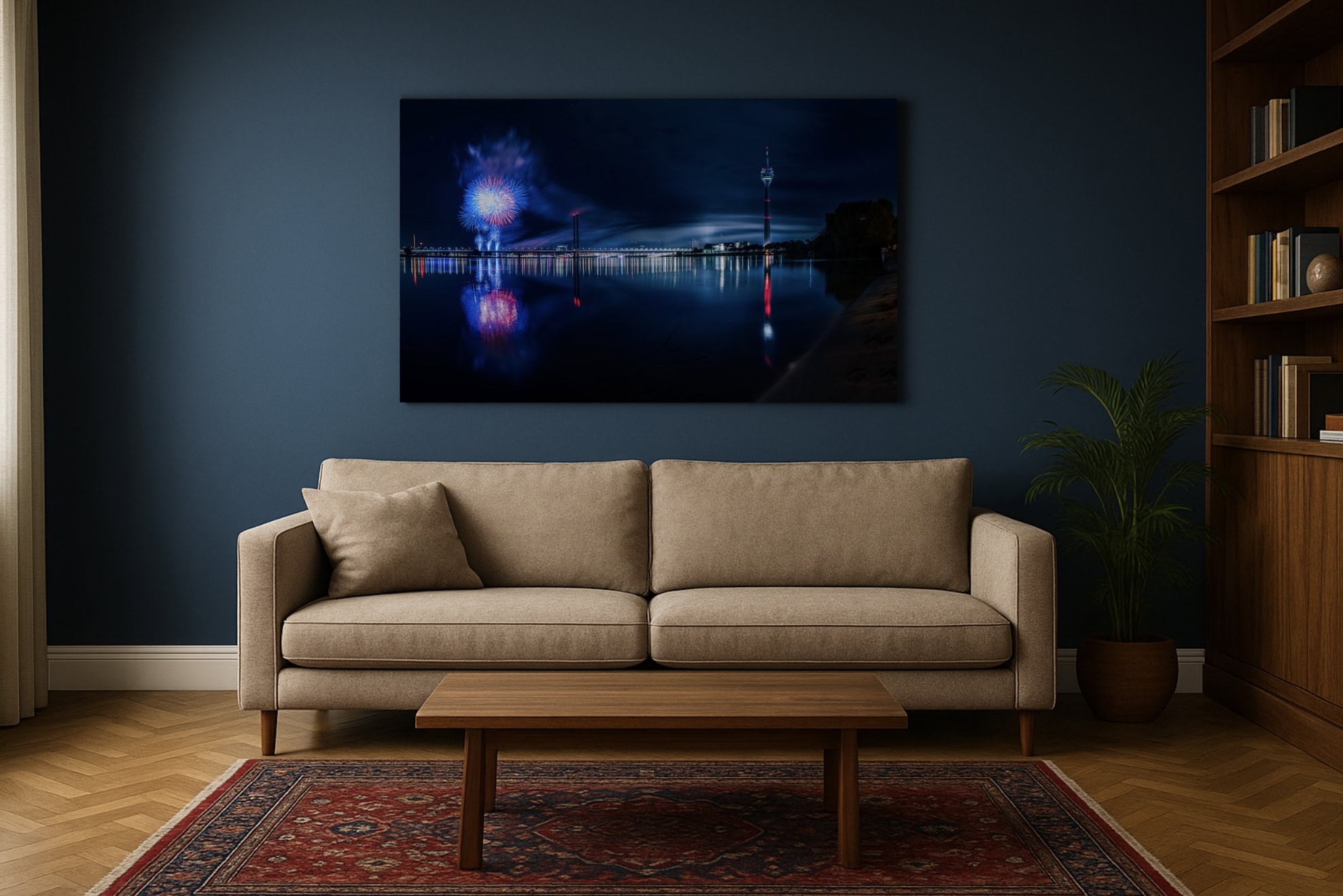 Düsseldorf Skyline | Feuerwerk mit Spiegelung am Rhein