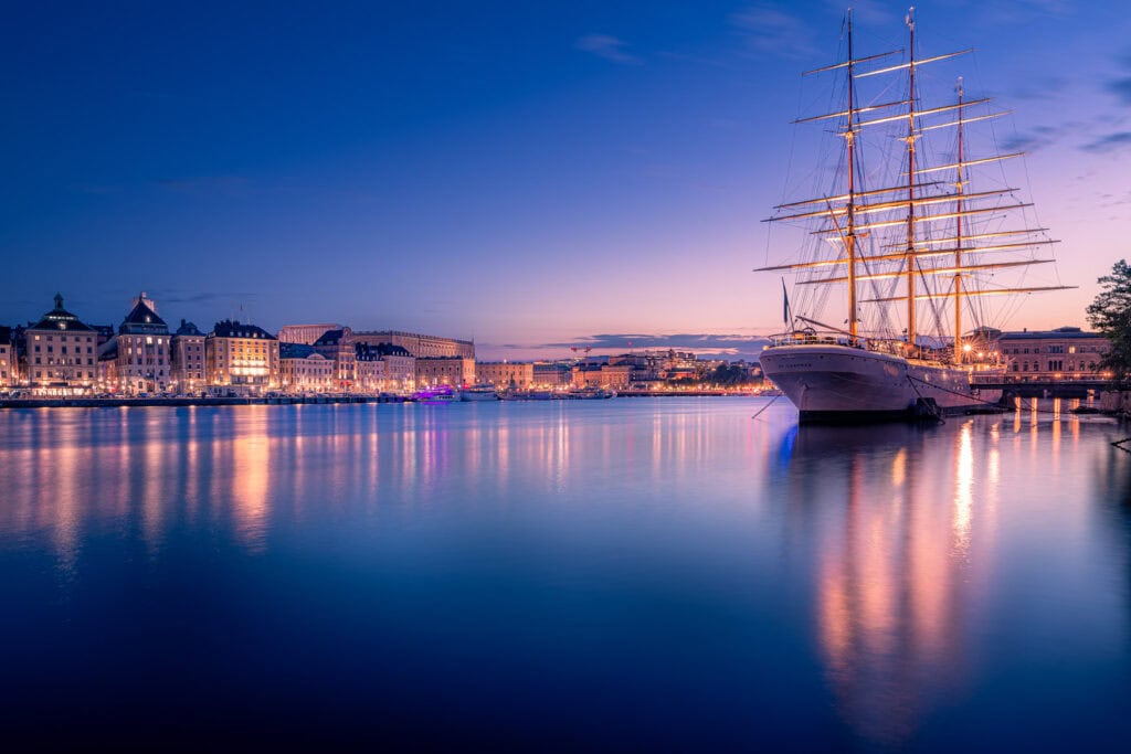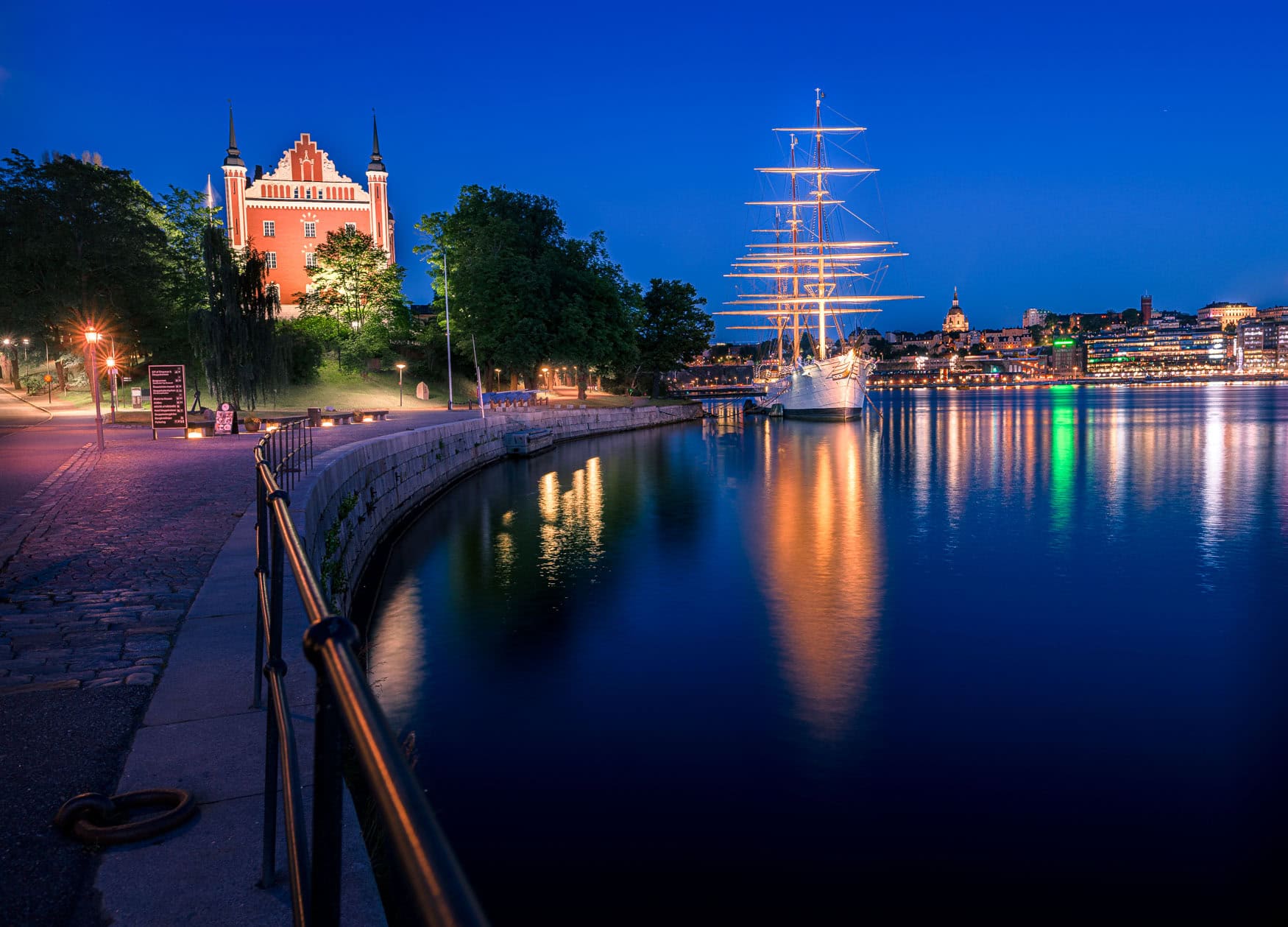 Wasser und Schiffe sind die zweite Konstante. Das Dreimast-Segelschiff Af Chapman vor Skeppsholmen spannt in der Blauen Stunde einen goldenen Faden über tiefes Blau. Ein maritimes, zeitloses Motiv, das als Wandbild Ruhe und Eleganz in Räume bringt.