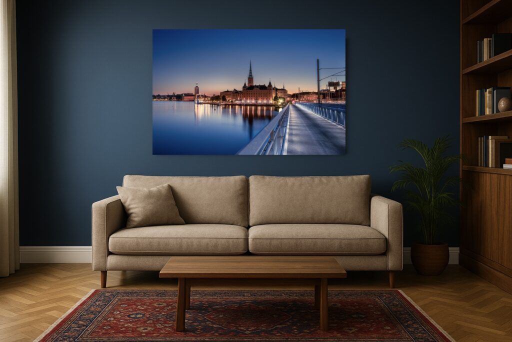 Alle Aufnahmen sind ruhig komponiert, präzise belichtet und zurückhaltend bearbeitet – damit sie als Fine-Art-Printslange tragen: auf Hahnemühle Fine-Art-Papier, Alu-Dibond oder Acrylglas. Die Serie ist in Größen erhältlich, die zu Wohn-, Arbeits- und Aufenthaltsräumen passen. Wenn Stockholm für dich Sehnsuchtsort ist – oder du diese besondere Mischung aus Wasser, Licht und Historie zuhause spüren möchtest –, findest du hier eine kuratierte Auswahl aus großen Panoramen und leisen Gassenmomenten.