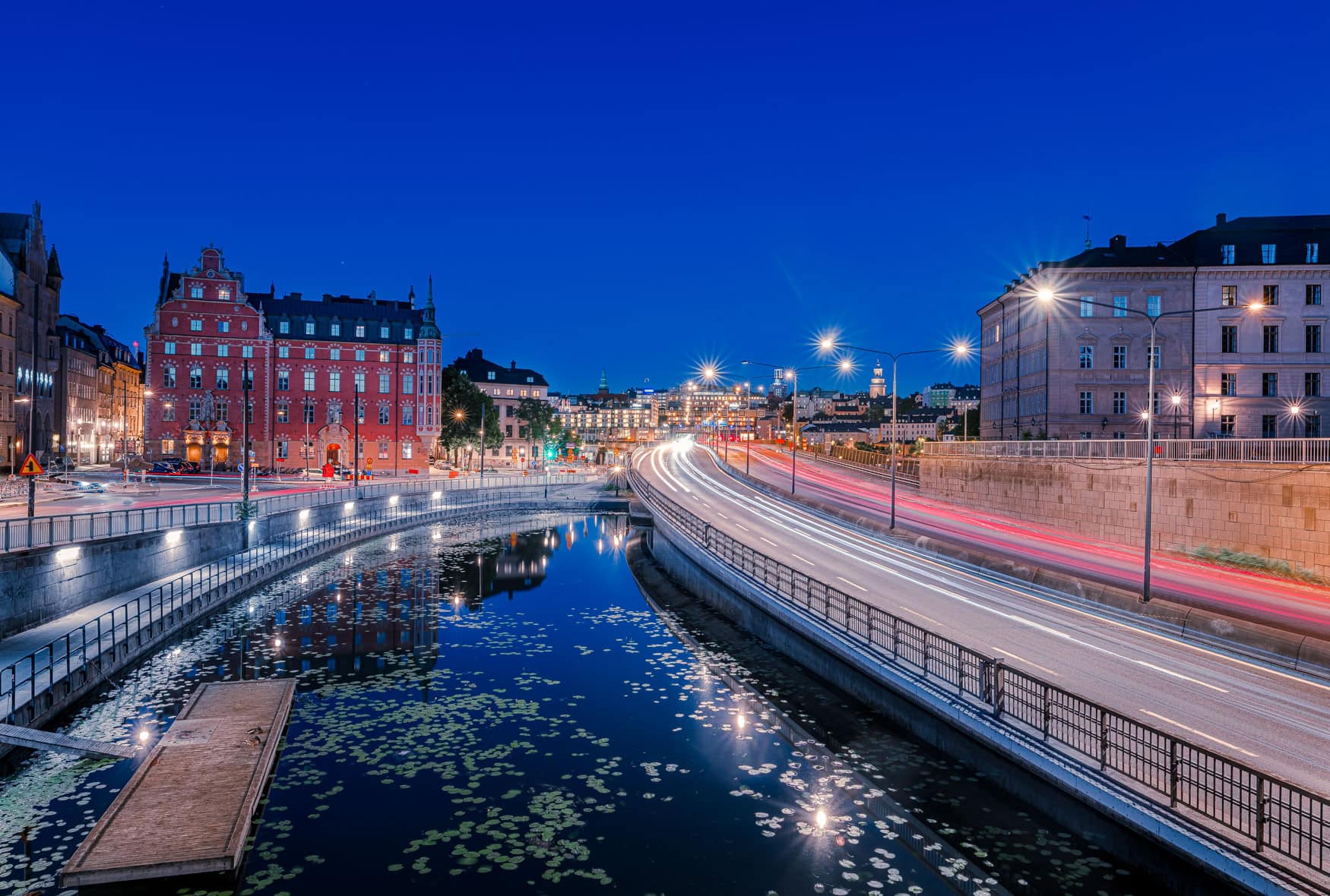 Den Gegenpol bilden dynamische Stadtachsen. Bei Stadshuset und der Centralbron ziehen Lighttrails wie helle Linien durch die Architektur, ohne die Szene zu überladen. Seerosen im Kanal bleiben der ruhige Gegenpol – typisch Stockholm: Bewegung und Stille im selben Bild.