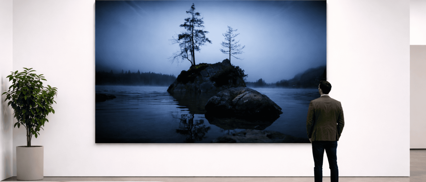 Bildidee × Oberfläche: Je hochwertiger die Oberfläche (z. B. Baryta/Museumsglas), desto stärker die Immersion – man fühlt sich eher im Motiv als davor.